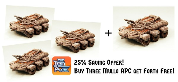 The big release for March 2018 is now online at The Ion Age!  Six different variants of the 15mm Mullo with wheels, tracks and repulsar (anti-gravity) propulsions as Armoured Fighting Vehicle (AFV) and Armoured Personnel Carrier (APC).  Easy to assemble and on average 45mm wide, 80mm long and 30mm tall with resin and white metal parts.  Go HERE for them with an offer plus the mega bundle deals which are on until 23rd March 2018.  Thanks for your support and read on for more information  plus a free download with the rules for these vehicles in Patrol Angis. Awesome!